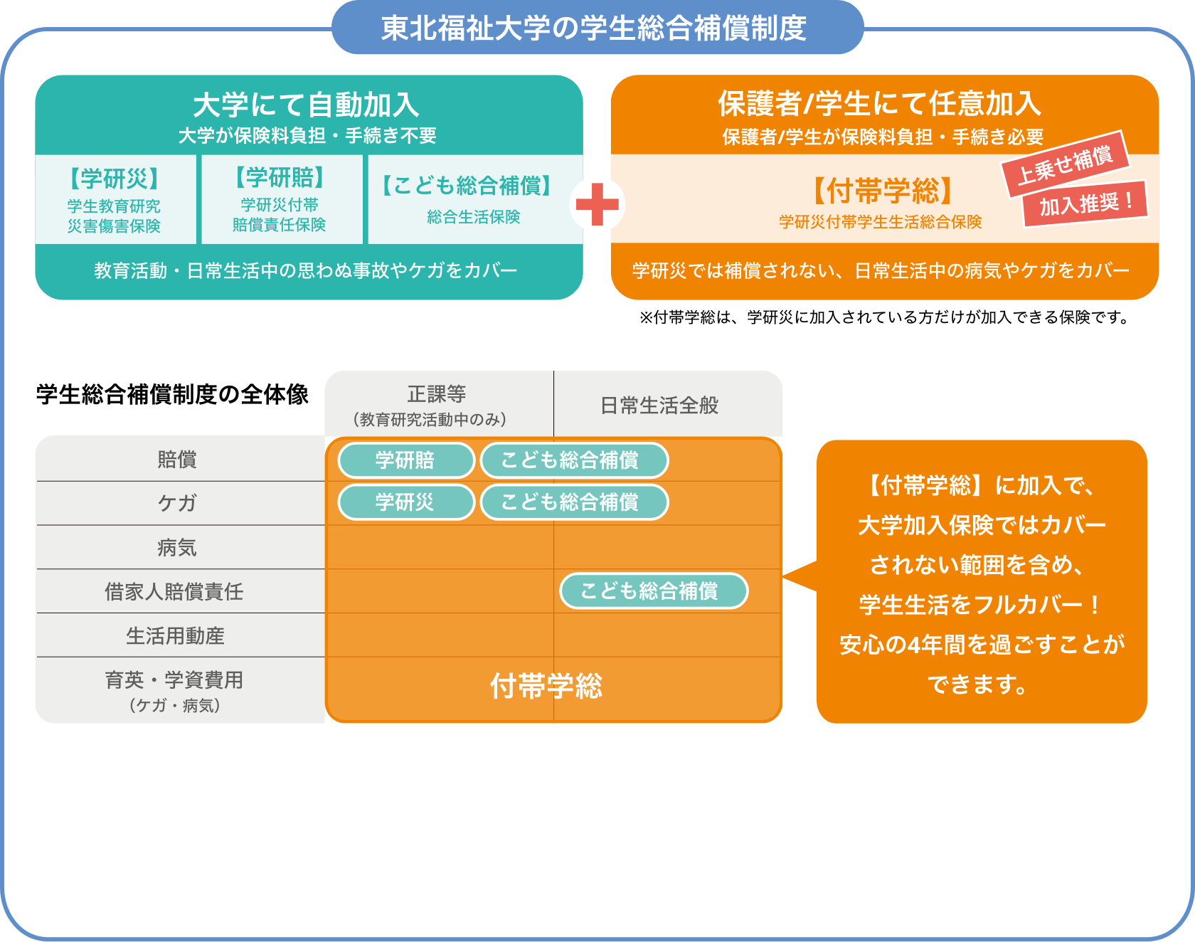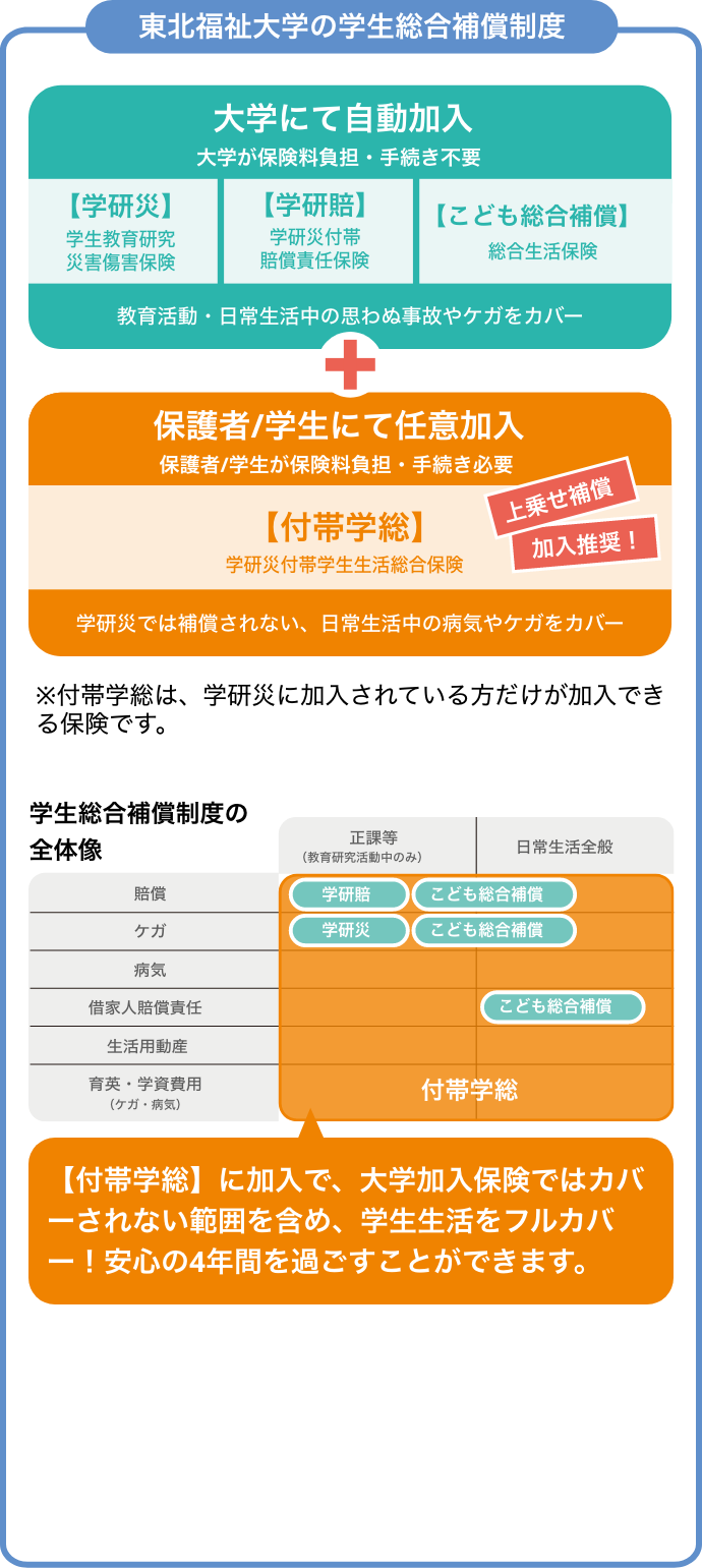 教育研究活動中に加えて、日常生活を含めた学生生活全般に幅広く、そして大学加入の保険では補償されない部分まで総合的に備える「付帯学総」の加入を推奨しております。