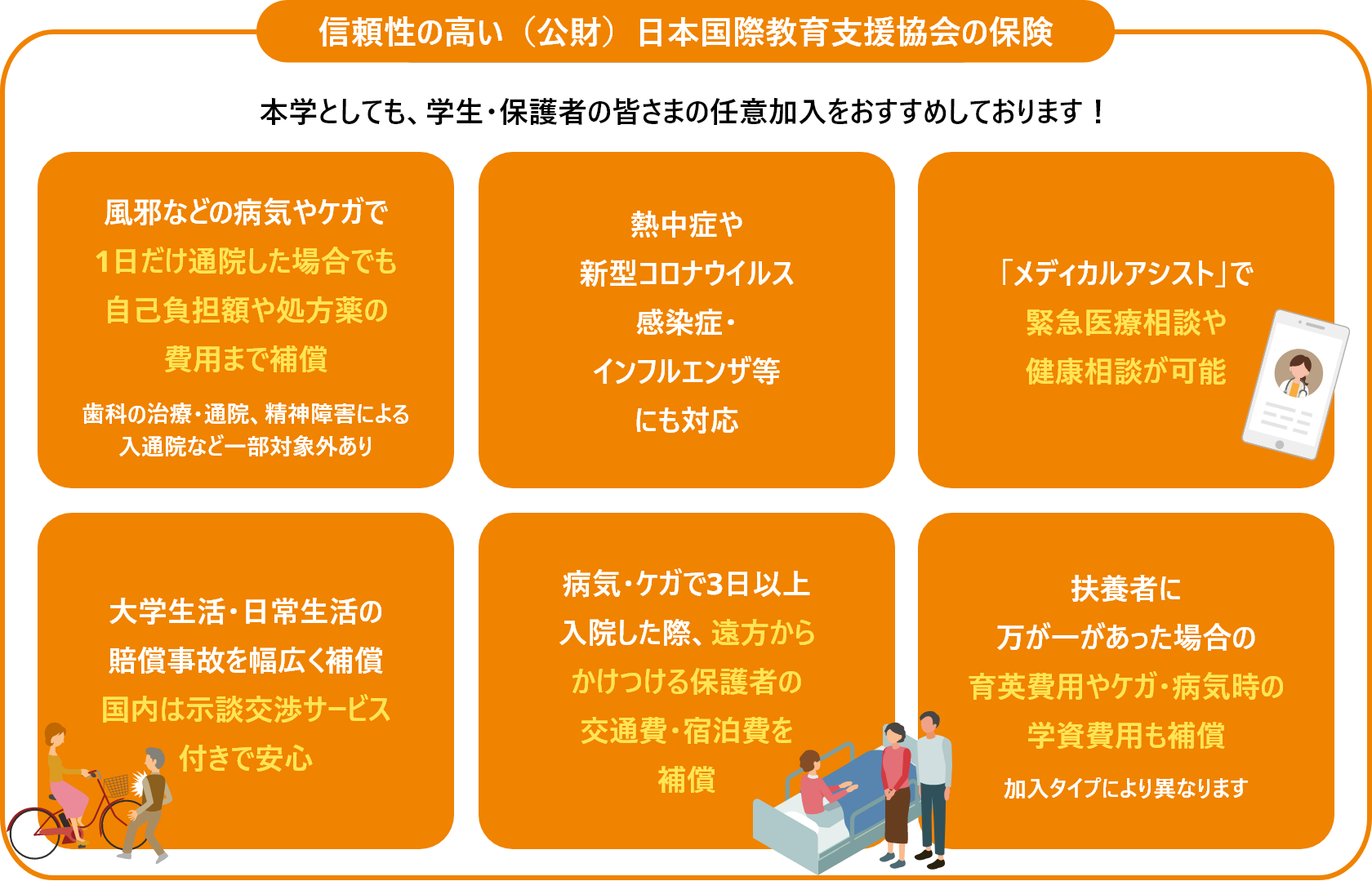 大学加入保険ではカバーしきれない「日常生活全般の病気やケガ、賠償」をサポートします。