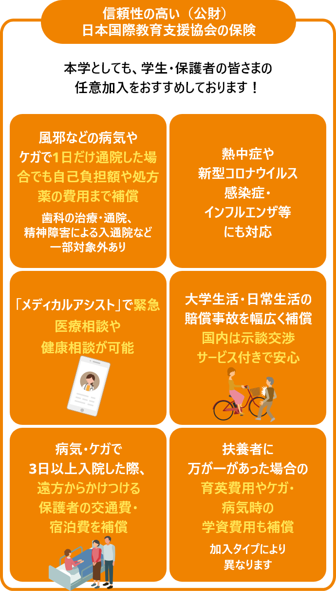 東北福祉大学では、学生の皆さんが安心して学生生活を送ることを目的に、学部学生、大学院生、科目等履修生を対象とした全国的にも手厚い「学生総合補償制度」を設けております。